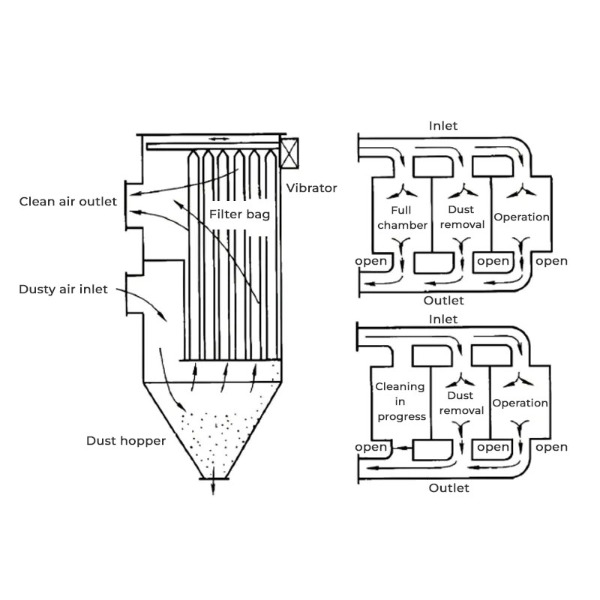 - Reinigungsmechanismus: Der Staubabscheider sollte über ein zuverlässiges Pulse-Jet-Reinigungssystem verfügen, das den Staub mithilfe von Druckluft aus den Filterbeuteln bläst und so ein Verstopfen verhindert.